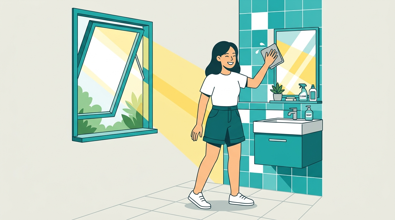 먼저 환풍기를 “오래” 켜는 것보다 “올바르게” 켜는 게 중요합니다. 문을 꽉 닫고 환풍기만 돌리면 공기 유입이 부족해 배출 효율이 떨어질 수 있어요. 샤워 후에는 문을 5~10cm 정도 열어 공기 길을 만들고, 가능하면 창이 있는 욕실은 창도 함께 10~15분 열어두면 좋습니다.